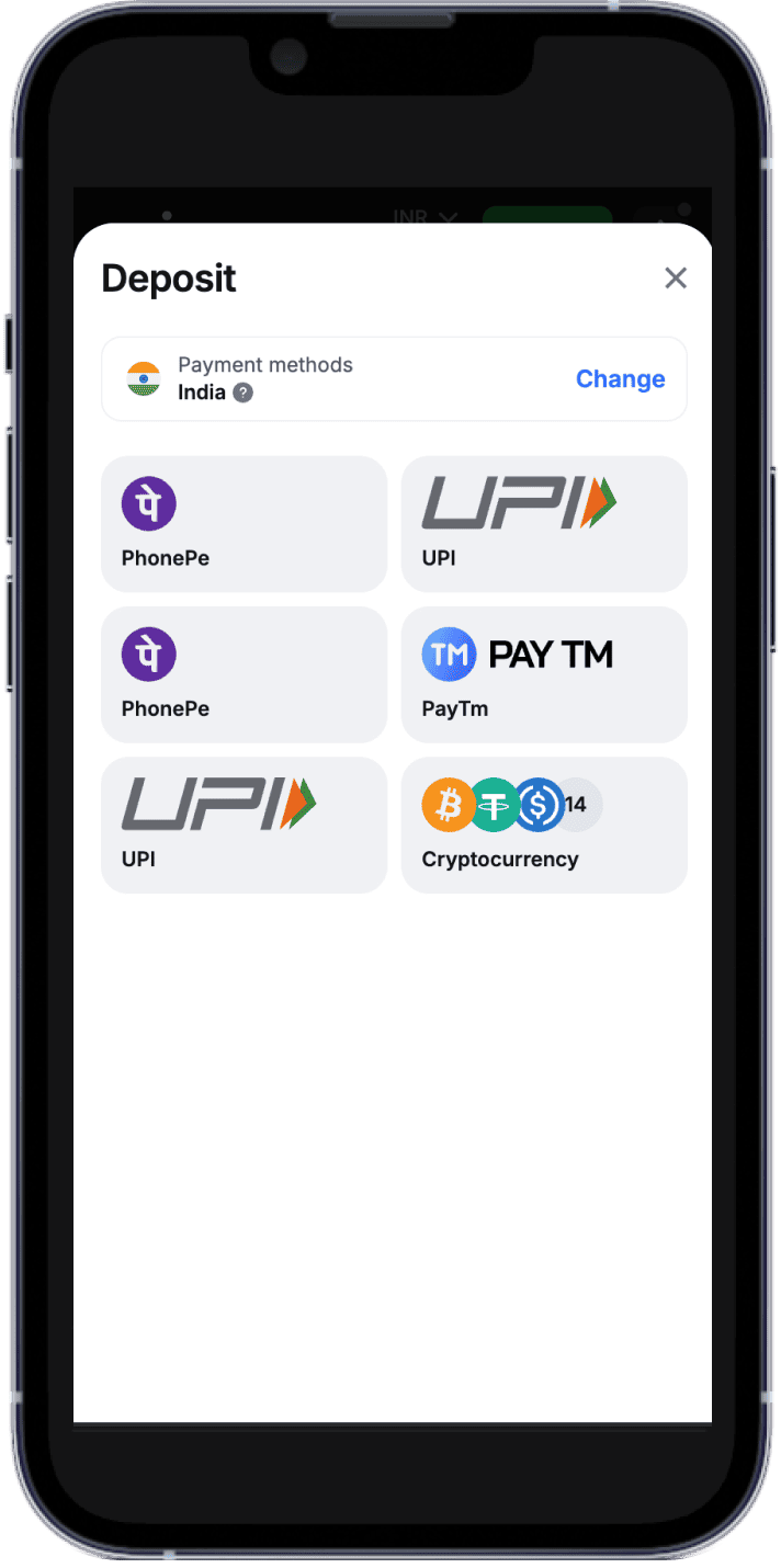 - Local payments. Fund in INR via UPI, Paytm, PhonePe, or crypto;